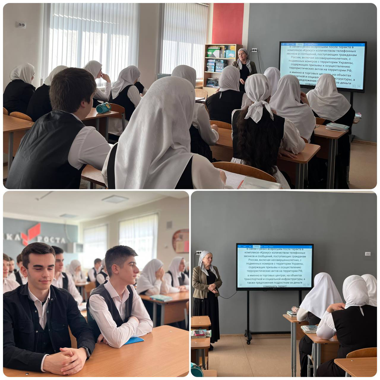 Отделом в Шалинском районе УФСБ России по Чеченской Республике совместно с МУ «Отдел образования Шалинского муниципального района Чеченской Республики» проведено профилактическое мероприятие в МБОУ «СОШ №1 п. Чири-Юрт» на тему: «В связи с резко возросшим после теракта в комплексе «Крокус» количеством телефонных звонков и сообщений, поступающих гражданам России, включая несовершеннолетних, с подменных номеров с территории Украины, содержащих призывы к осуществлению террористических актов на территории РФ, а именно в торговых центрах, на объектах транспортной и социальной инфраструктуры, а также предложения подросткам за деньги совершать теракт».