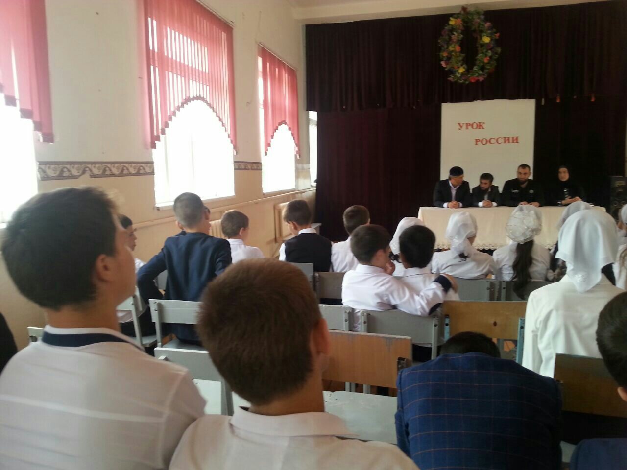 Урок России 01.09.18г в МБОУ СОШ √1 п.Чири Юрт провели помощник председседателя Парламента ЧР Абдулвагапов Д.А, директор женского медресе Юсупова М.А., Вице-Президент Федерации ДЗЮДО России Нункаев Х.А.